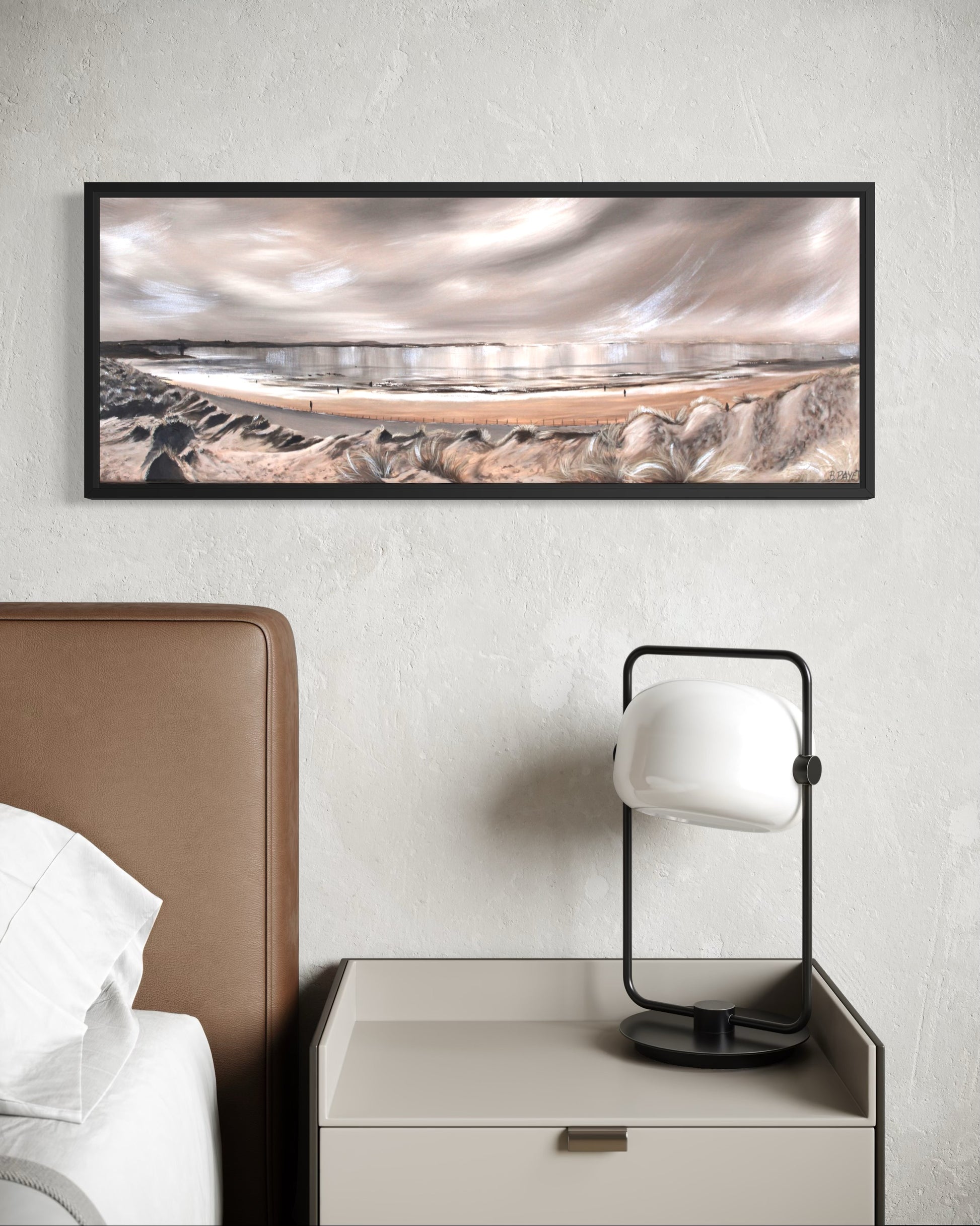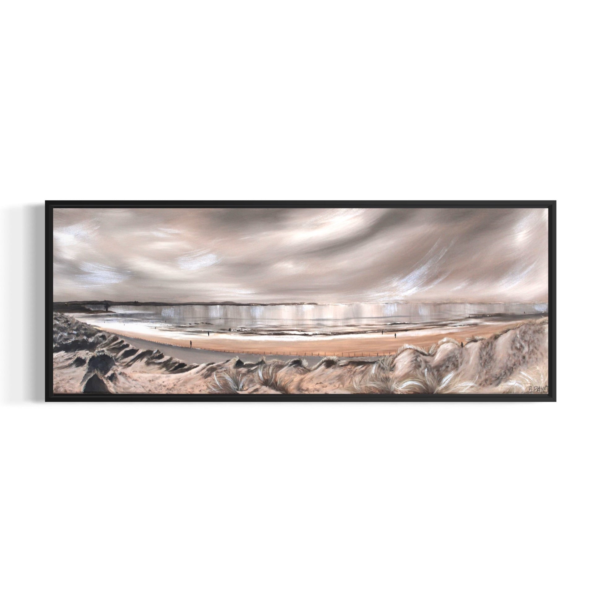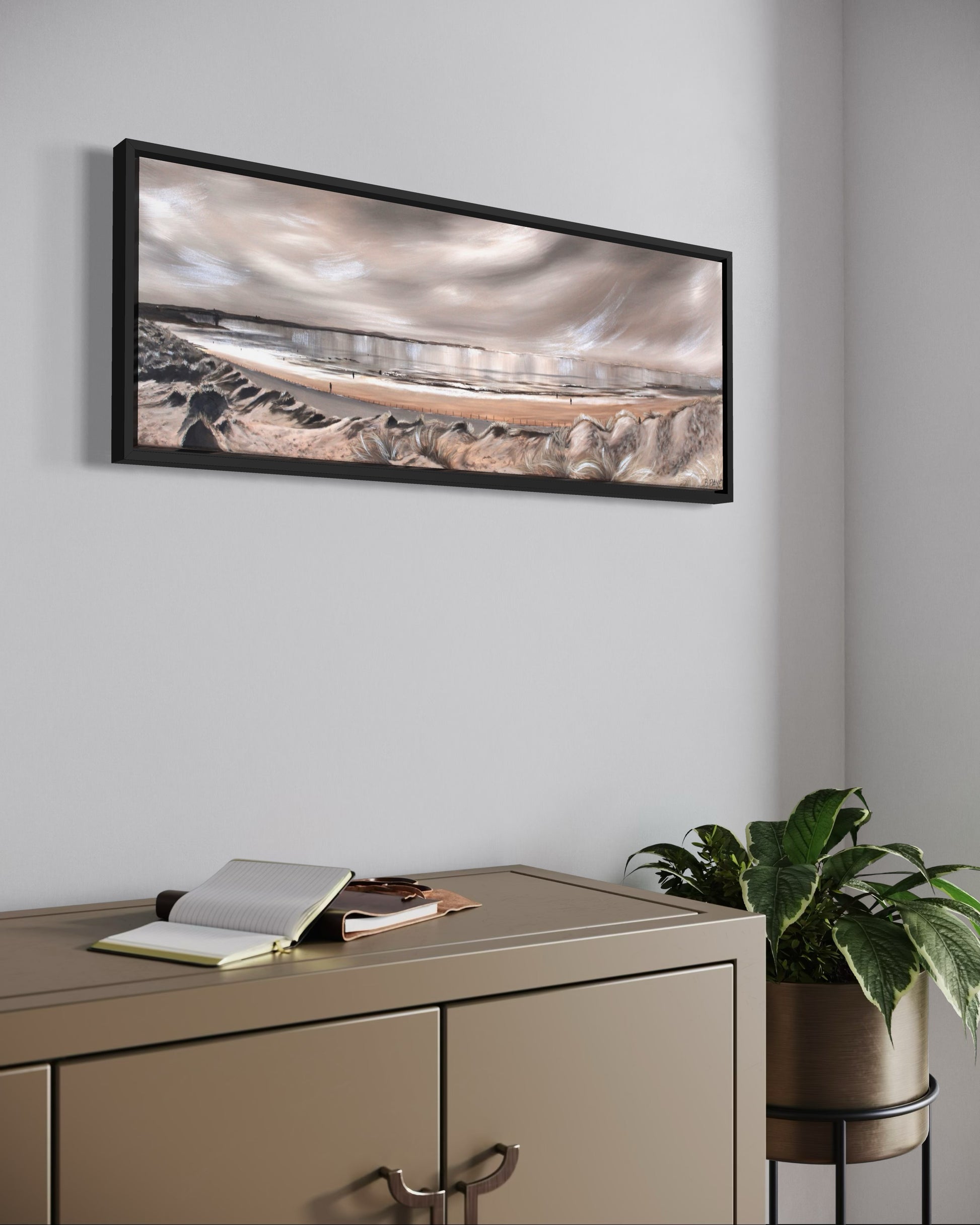 "Crosby Beach" acrylic on canvas, 12x32" framed in black floater frame, ready-to-hang. The final painting in my "Liverpool, With Love" collection depicts the beautiful Crosby beach and iron men.