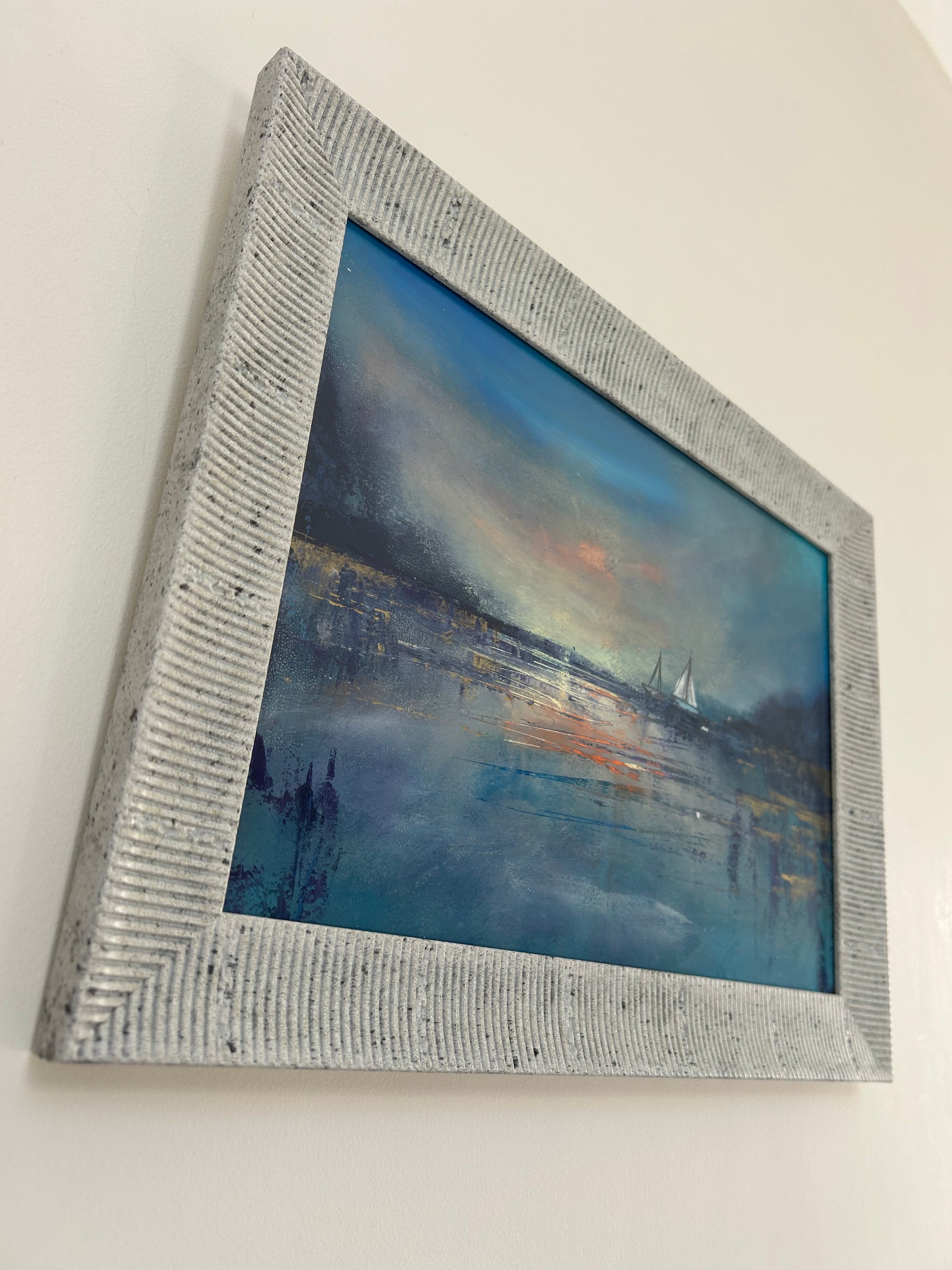“Lonely Dawn”, containing my favourite boat motif, was painted intuitively and developed over a number of layers. Flashes of orange shine through the layers, as the sun would through the clouds at dusk. The painting may tell you a story or give you a feeling but that is up to you. Textured with hints of gold, contrasting the moody shadows and reflecting light upon the water. Framed in a natural linen-style frame, an ideal small original painting to add some mood and atmosphere to a wall.