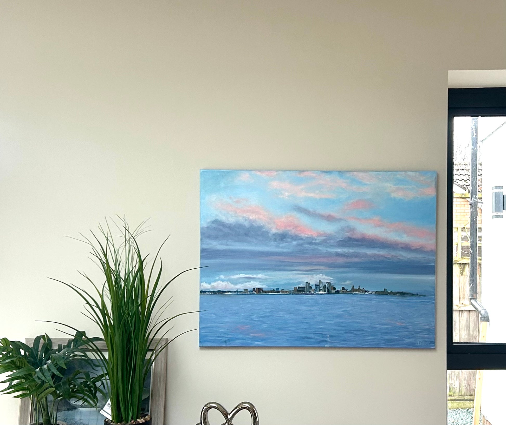 Original 24x32" original oil painting by Bethany Payet. Depicting the beautiful Liverpool skyline at dusk during a trip in my campervan as I overlooked the river Mersey.