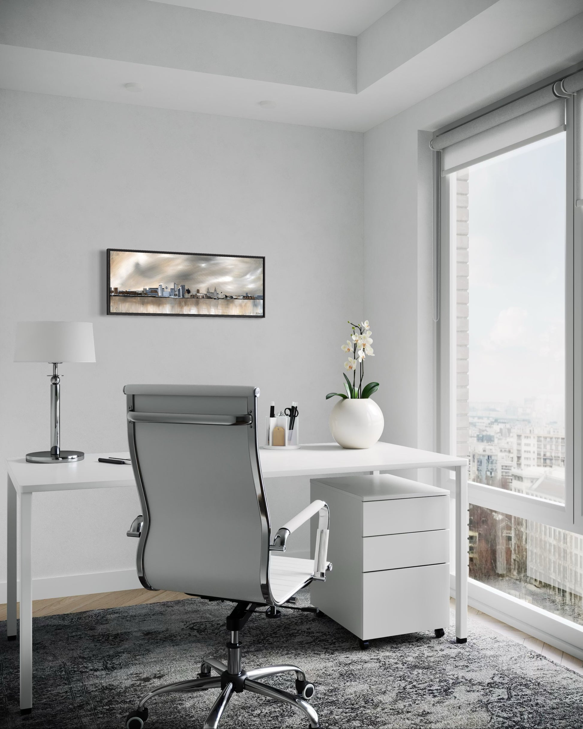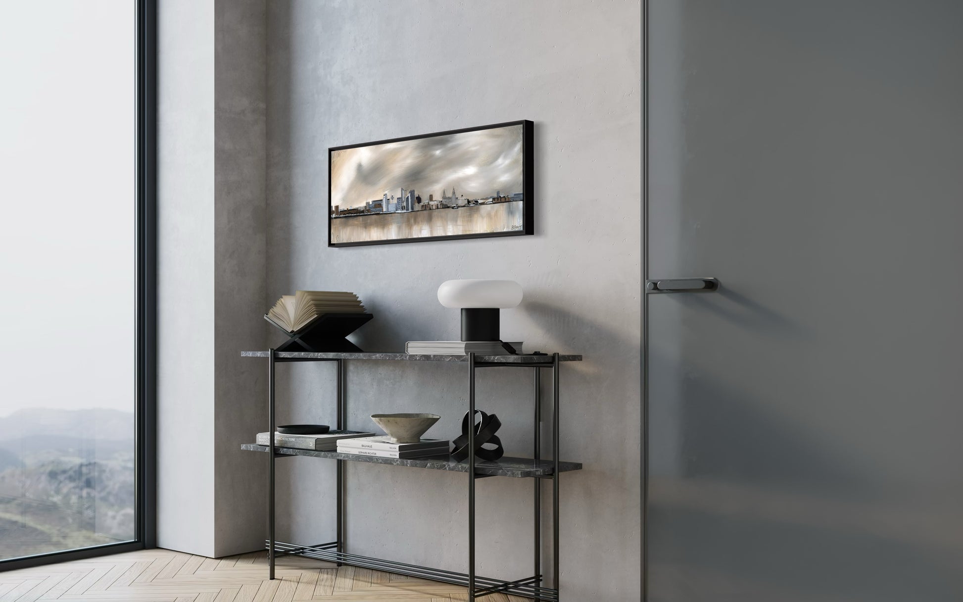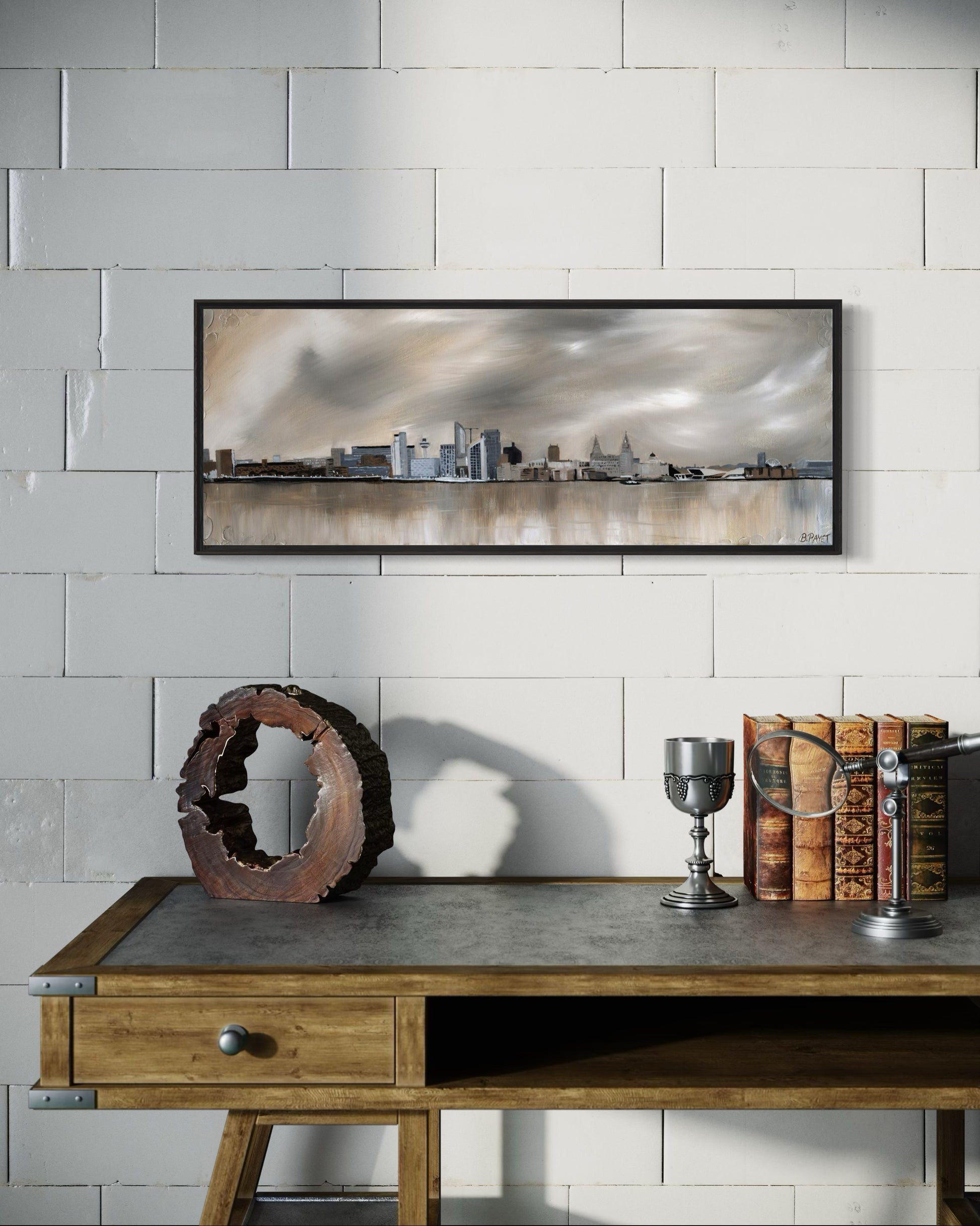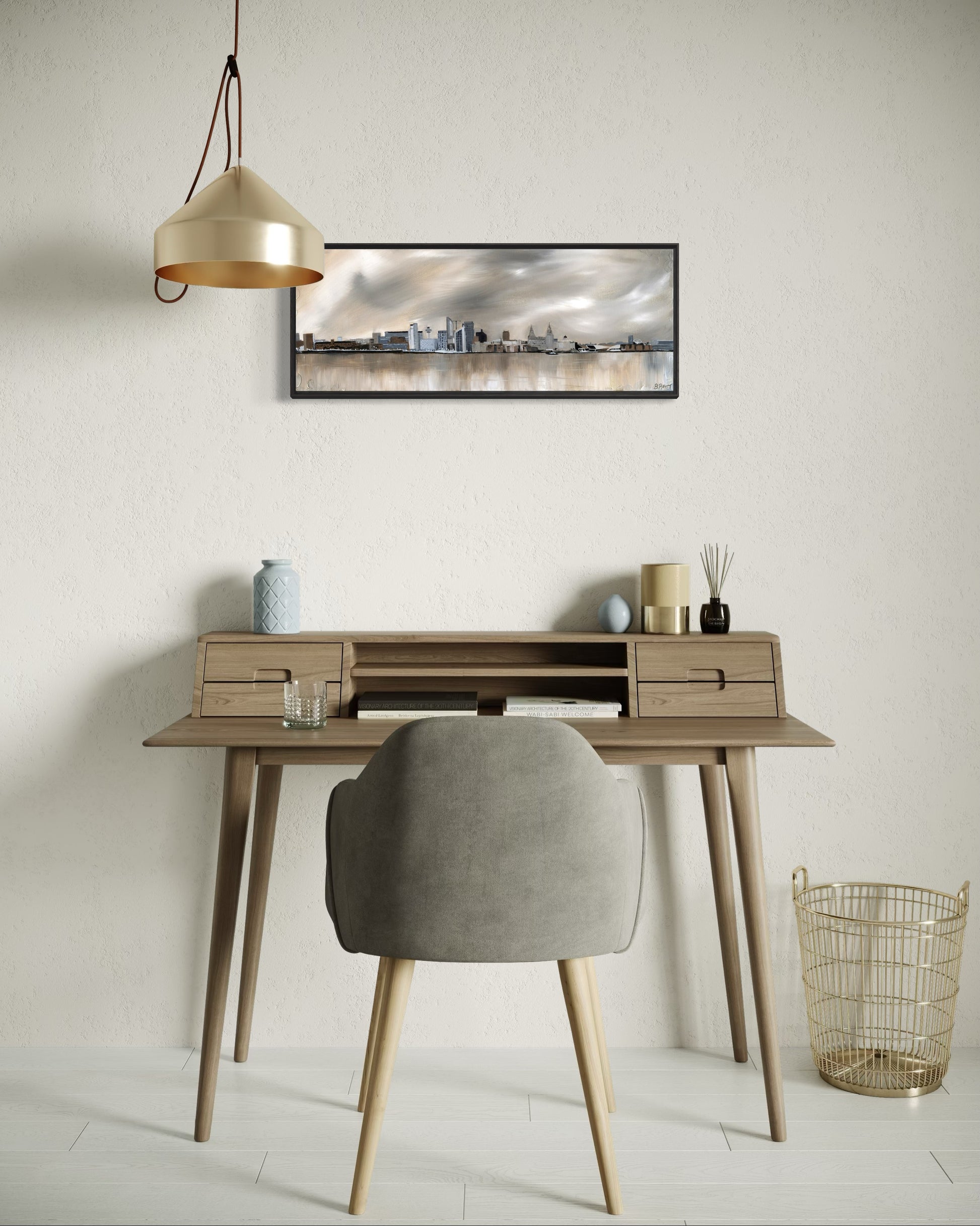 Liverpool's iconic skyline along the waterfront is one of the most beautiful urban landscapes in the UK. This is also the second time I have painted the skyline and what a view it is. Painted in neutrals and champagne gold to complement modern interiors.